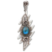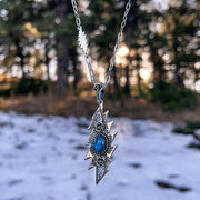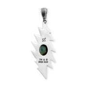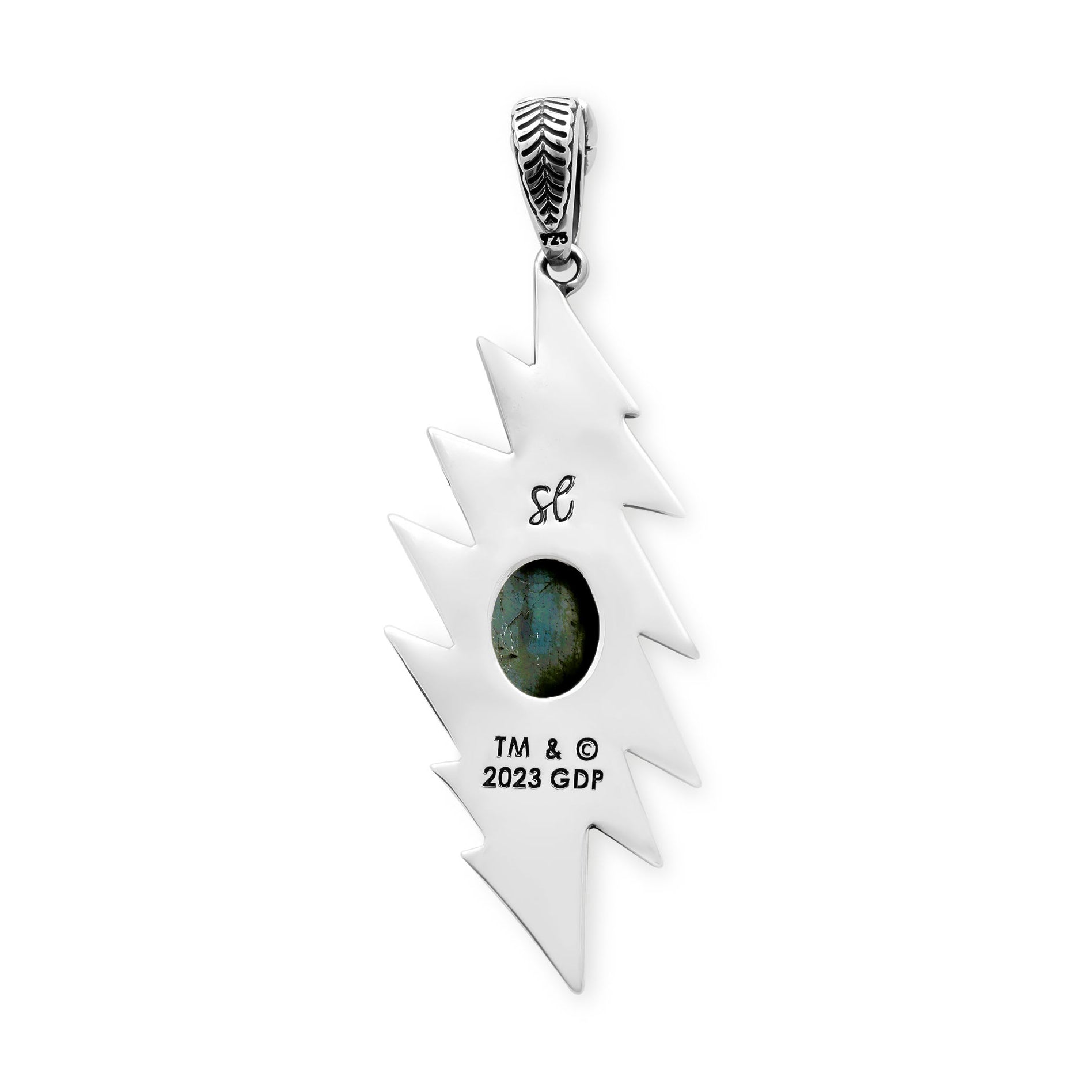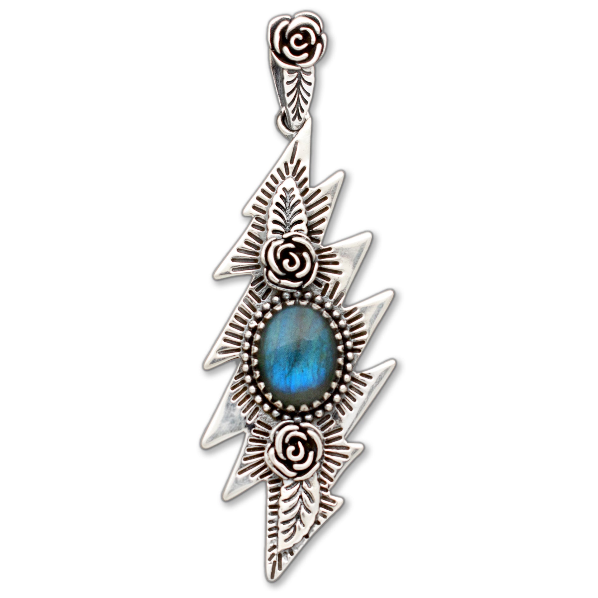 A Sterling Silver Pendant featuring a Natural Labradorite Stone, Set in a classic Grateful Dead 13 Point Lightning Bolt, with Rose motifs and Geometric designs on on Bolt, and our signature Rose Bail.