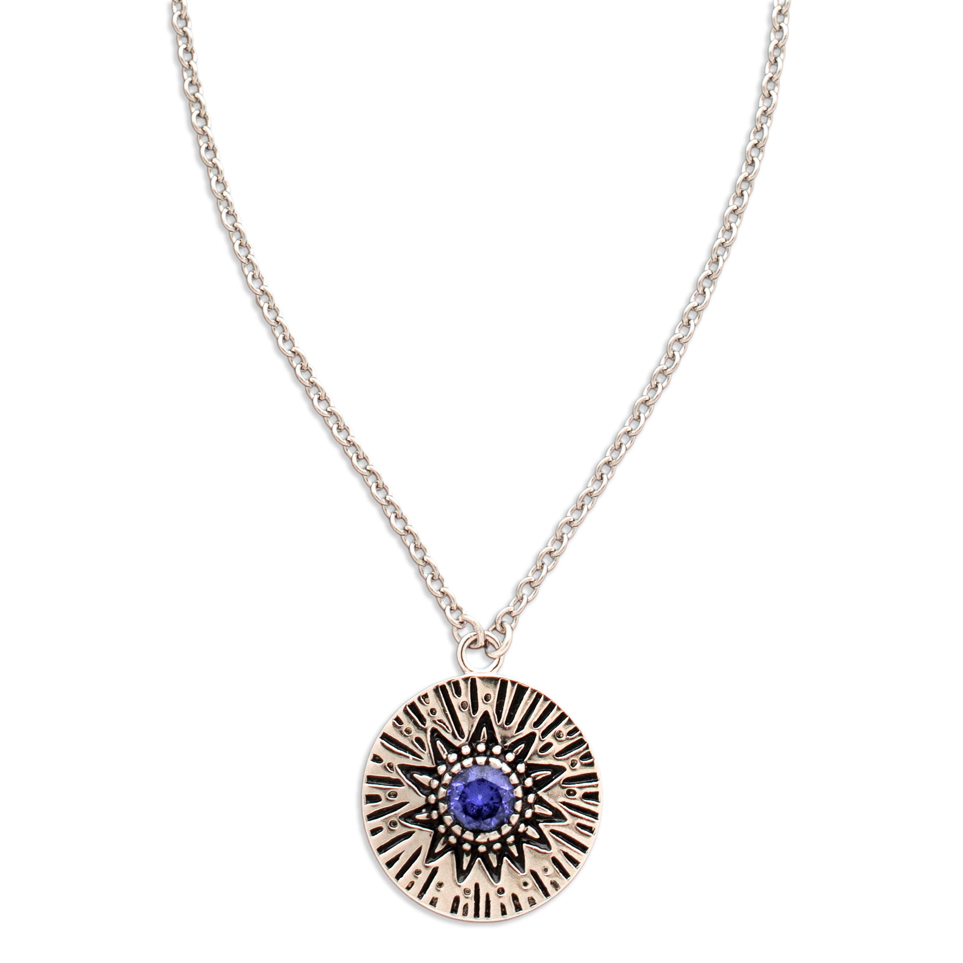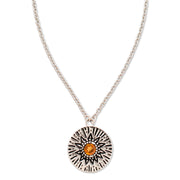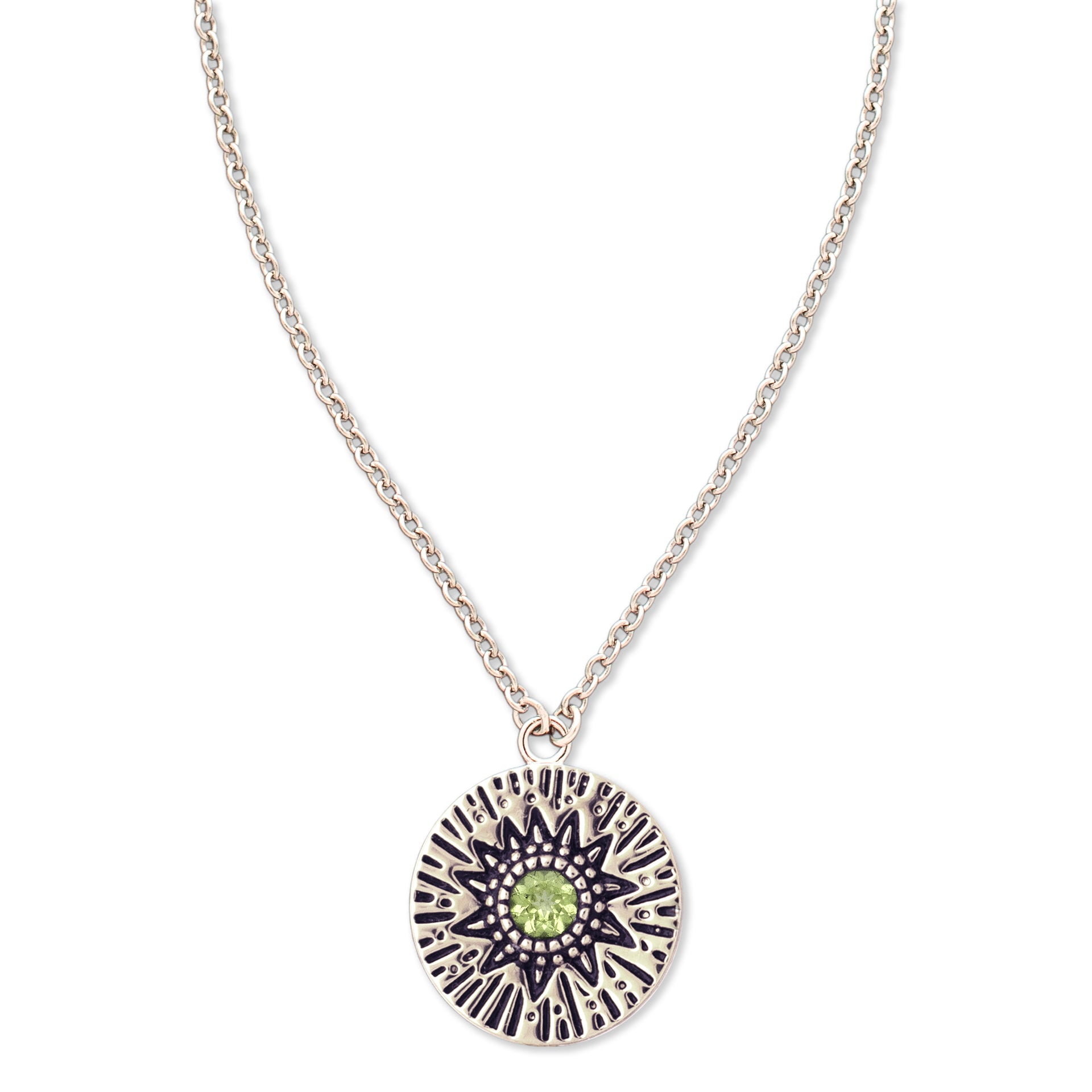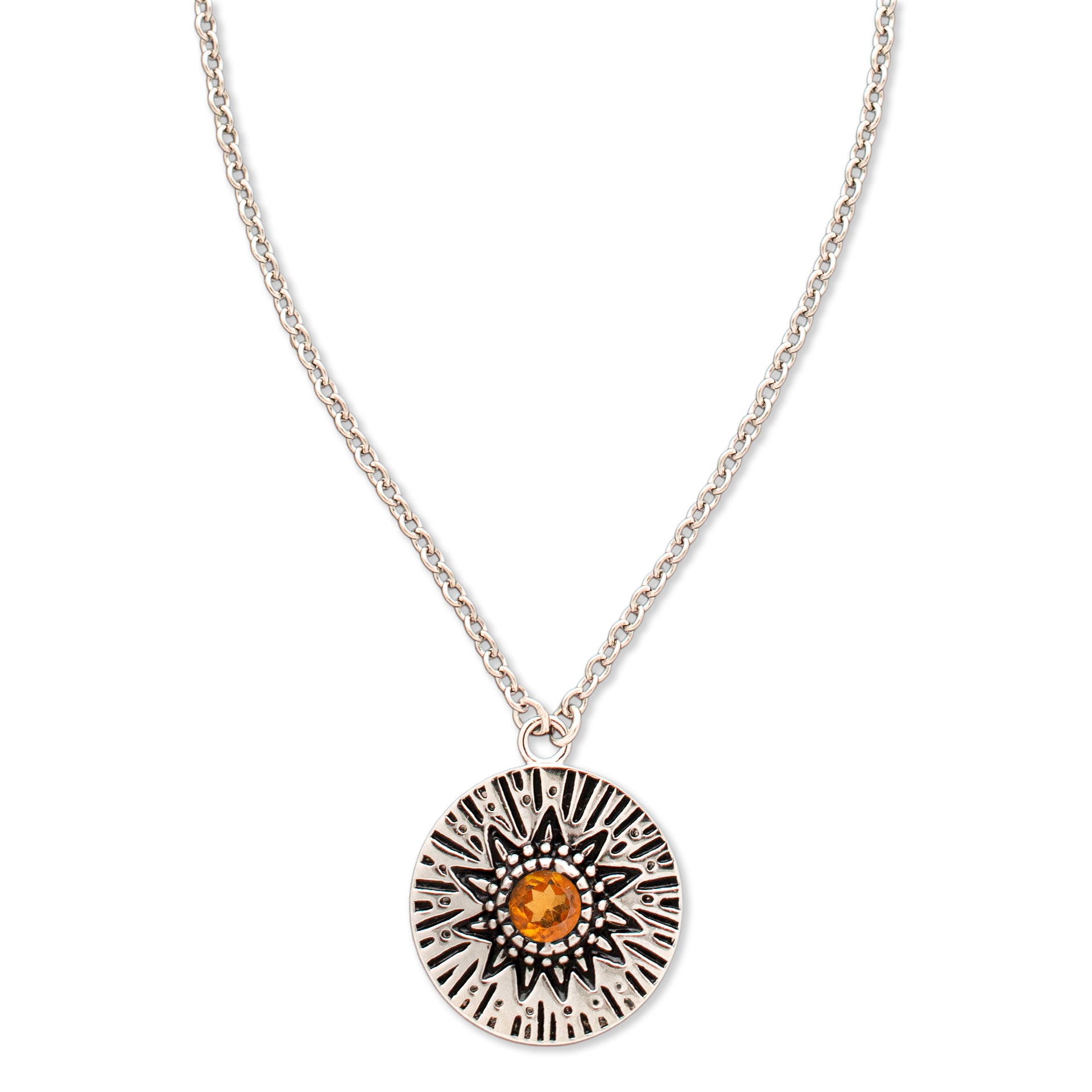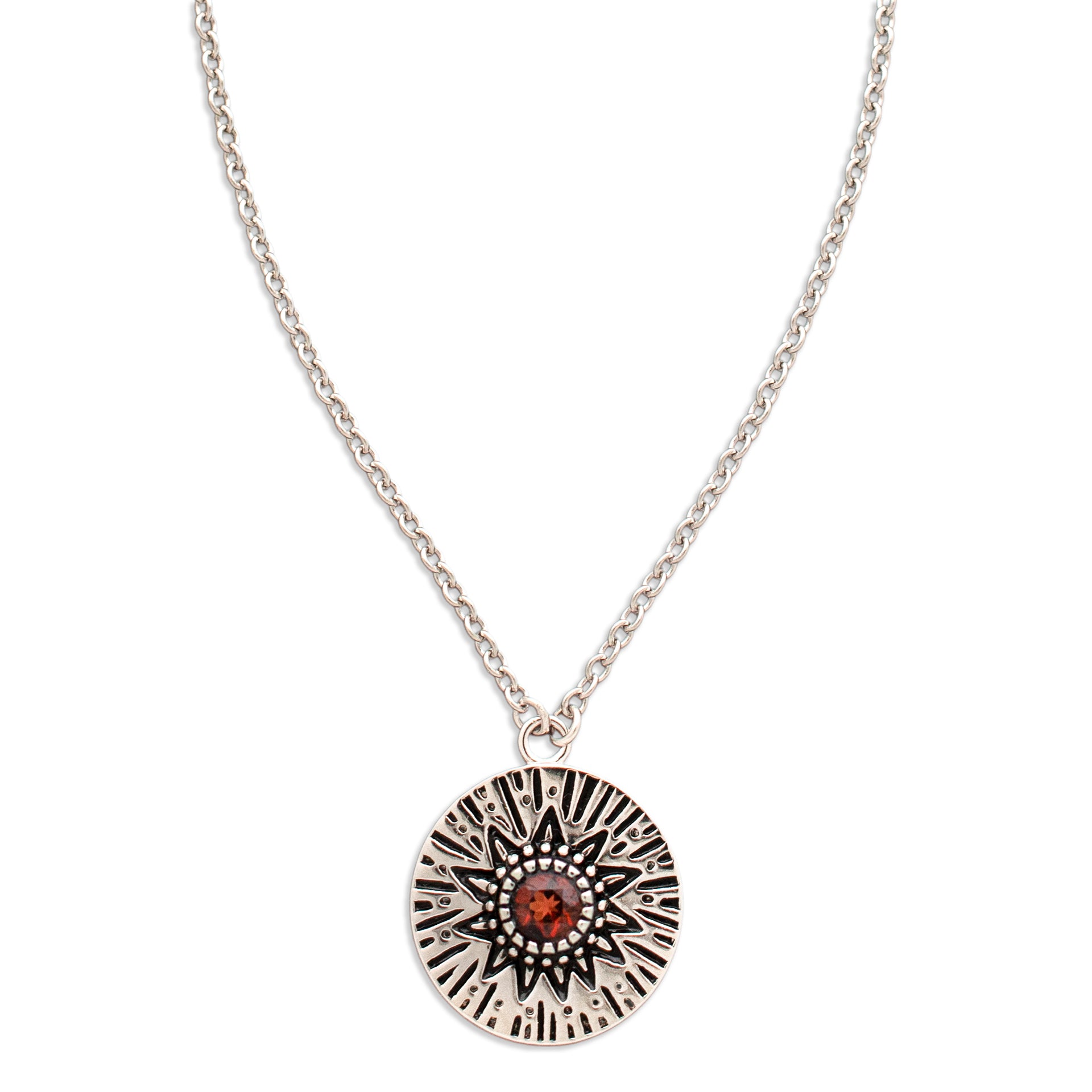 - A delicate Birthstone Necklace featuring a pendant with carved Sun rays motif, around a 4mm gemstone.