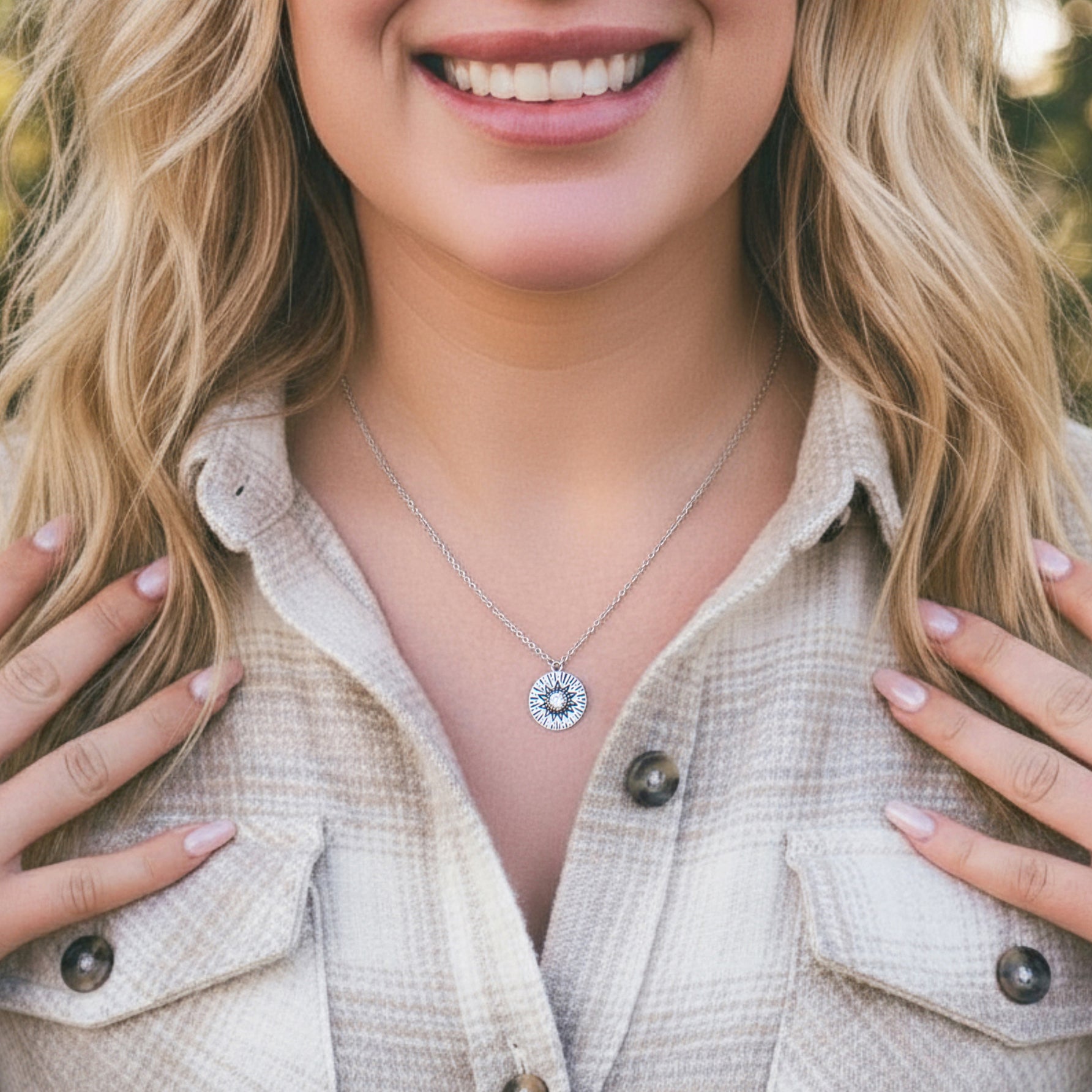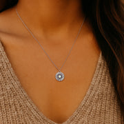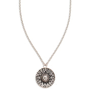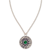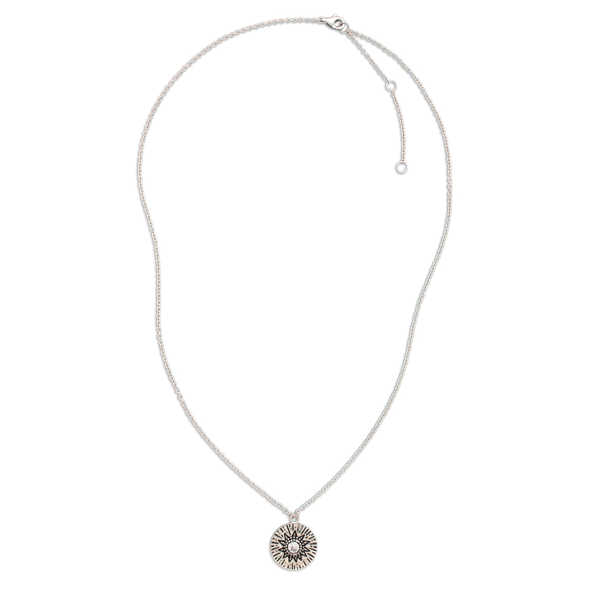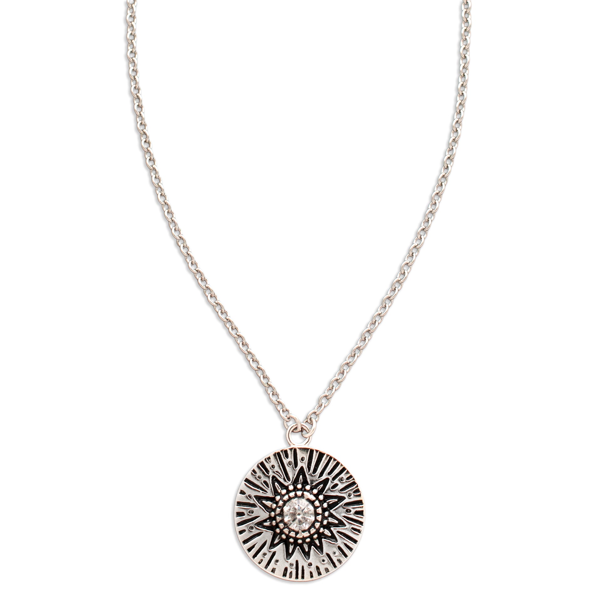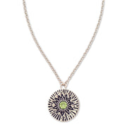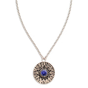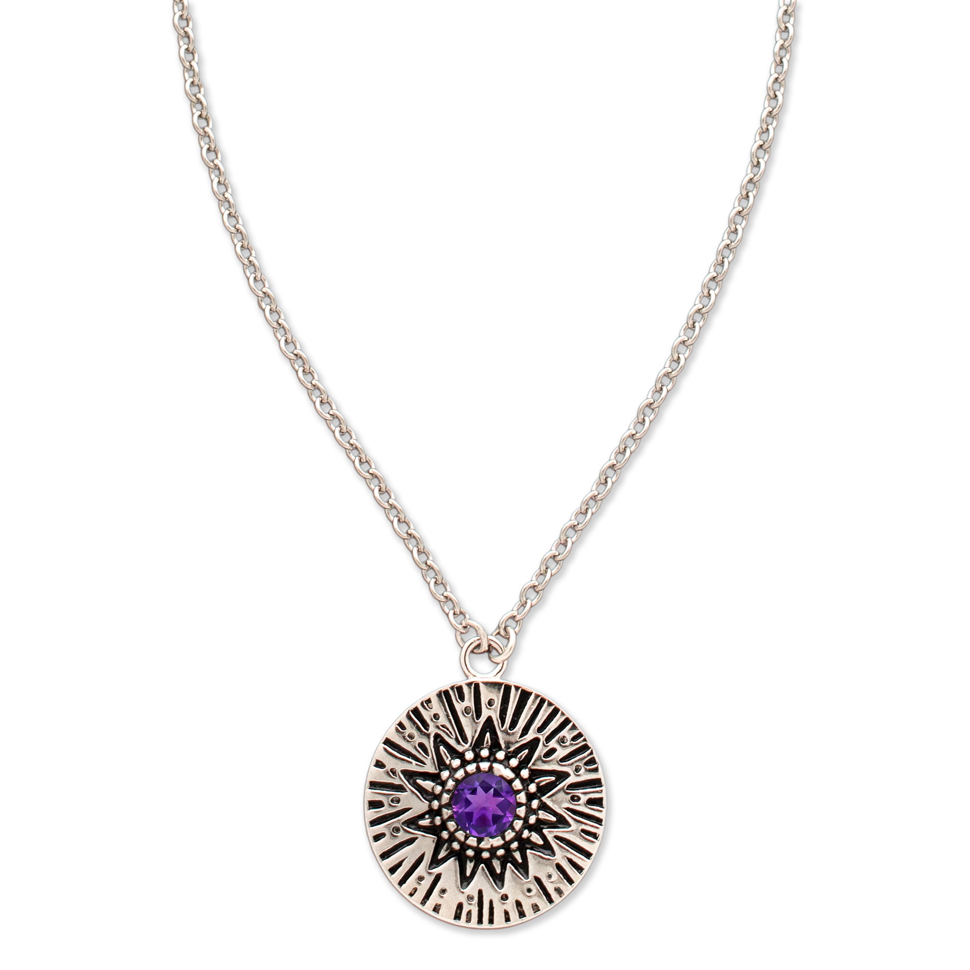 - A delicate Birthstone Necklace featuring a pendant with carved Sun rays motif, around a 4mm gemstone.