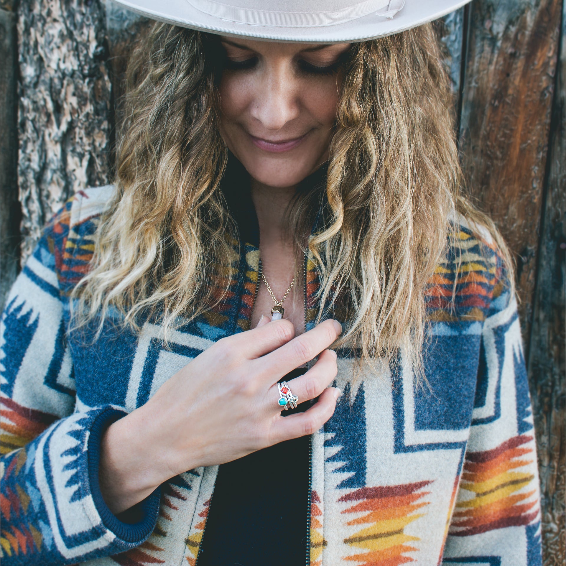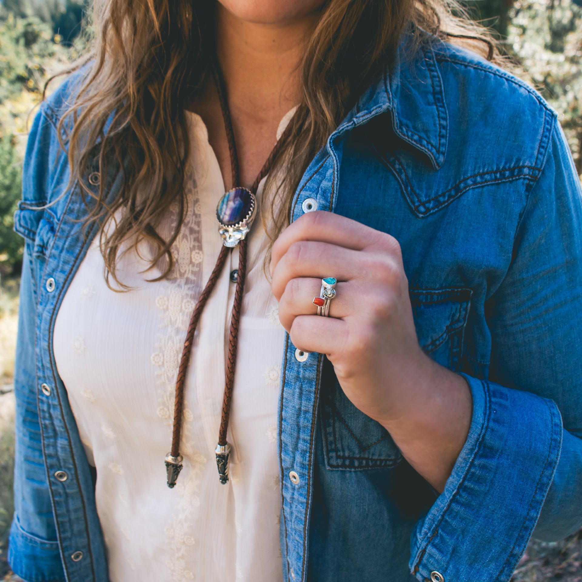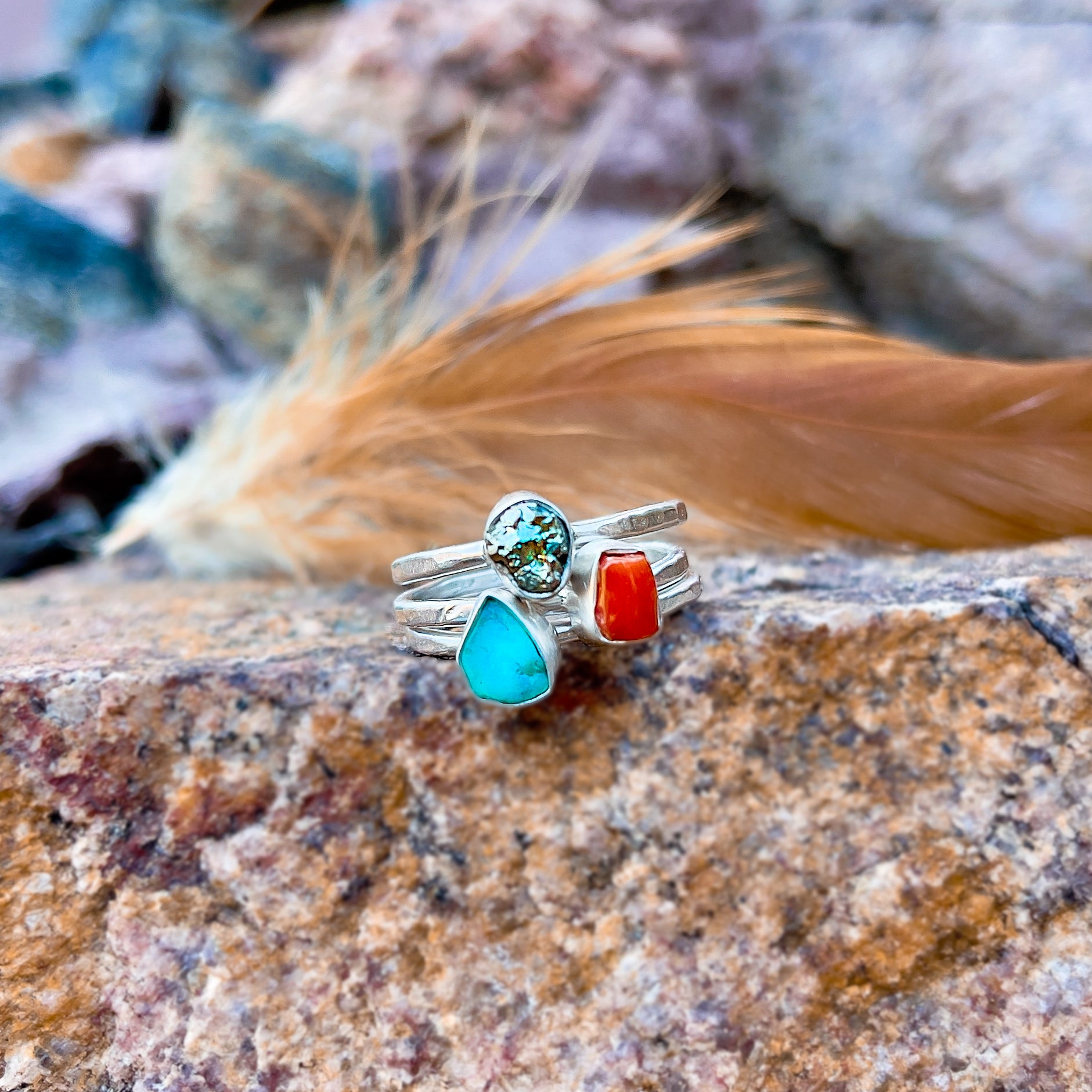 - A Set of 3 Stacking Rings, featuring natural Turquoise, Coral, and and Pyrite stones / crystals set in 925 Sterling Silver