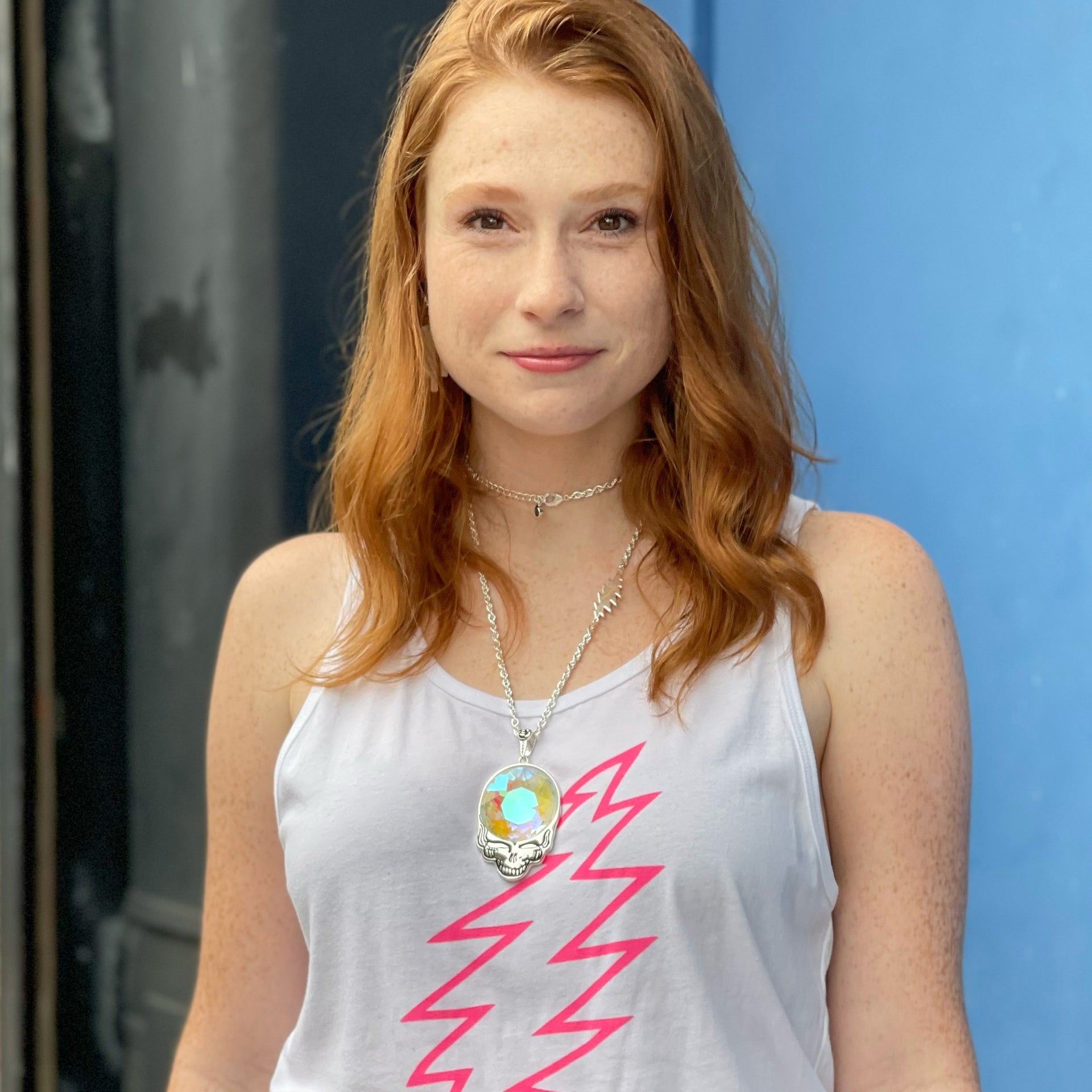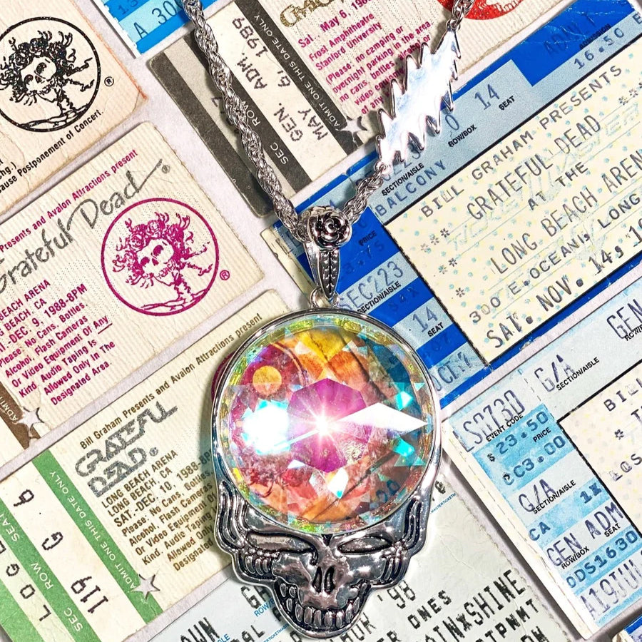 • A Classic Steal Your Face Skull cast in Silver plated brass, with Rainbow Prism Crystal and Rose design on Bail.