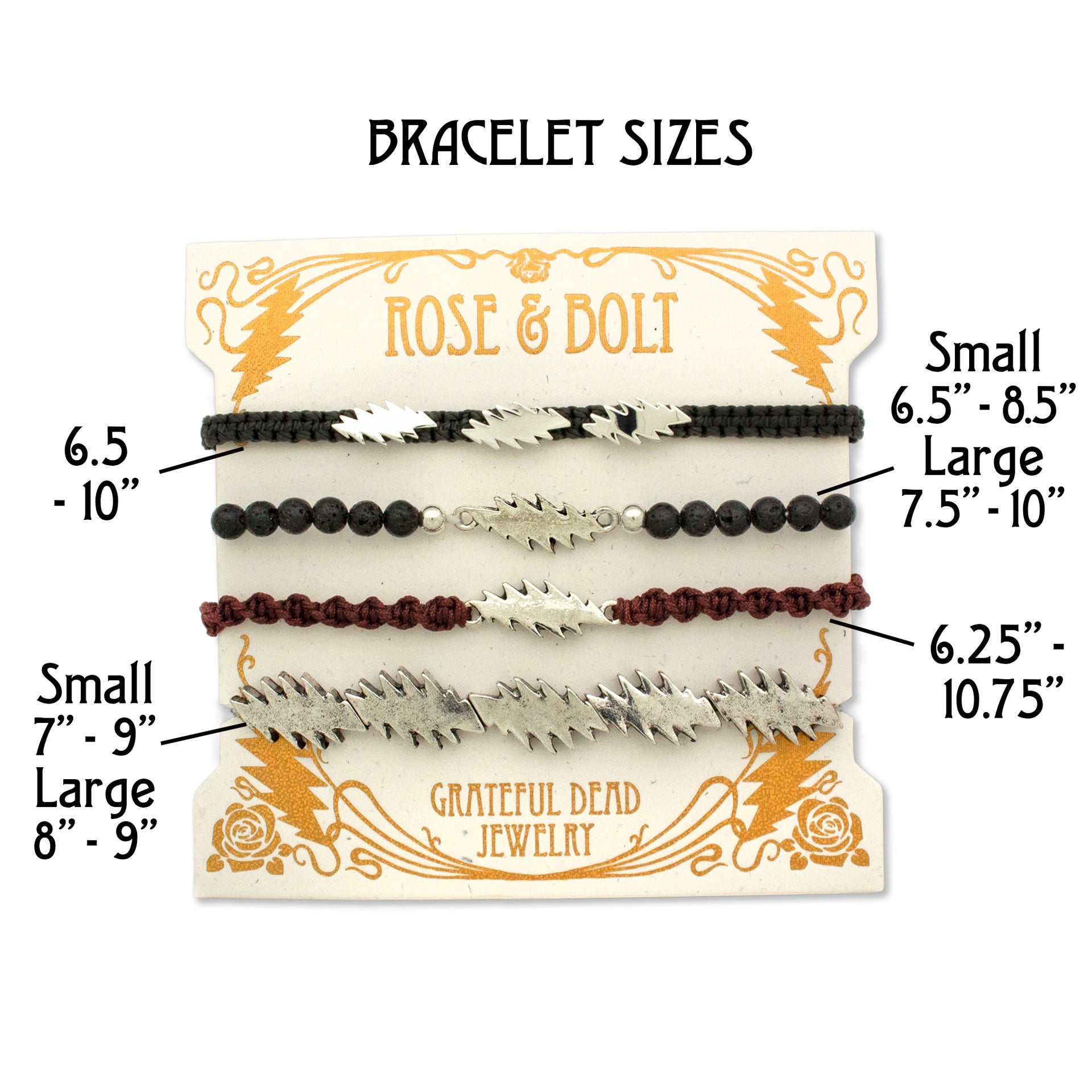- choose from large or small wrist size. See size chart for measurements. Only the Beaded bracelets vary, for small and large sizes. All bracelets are adjustable.