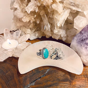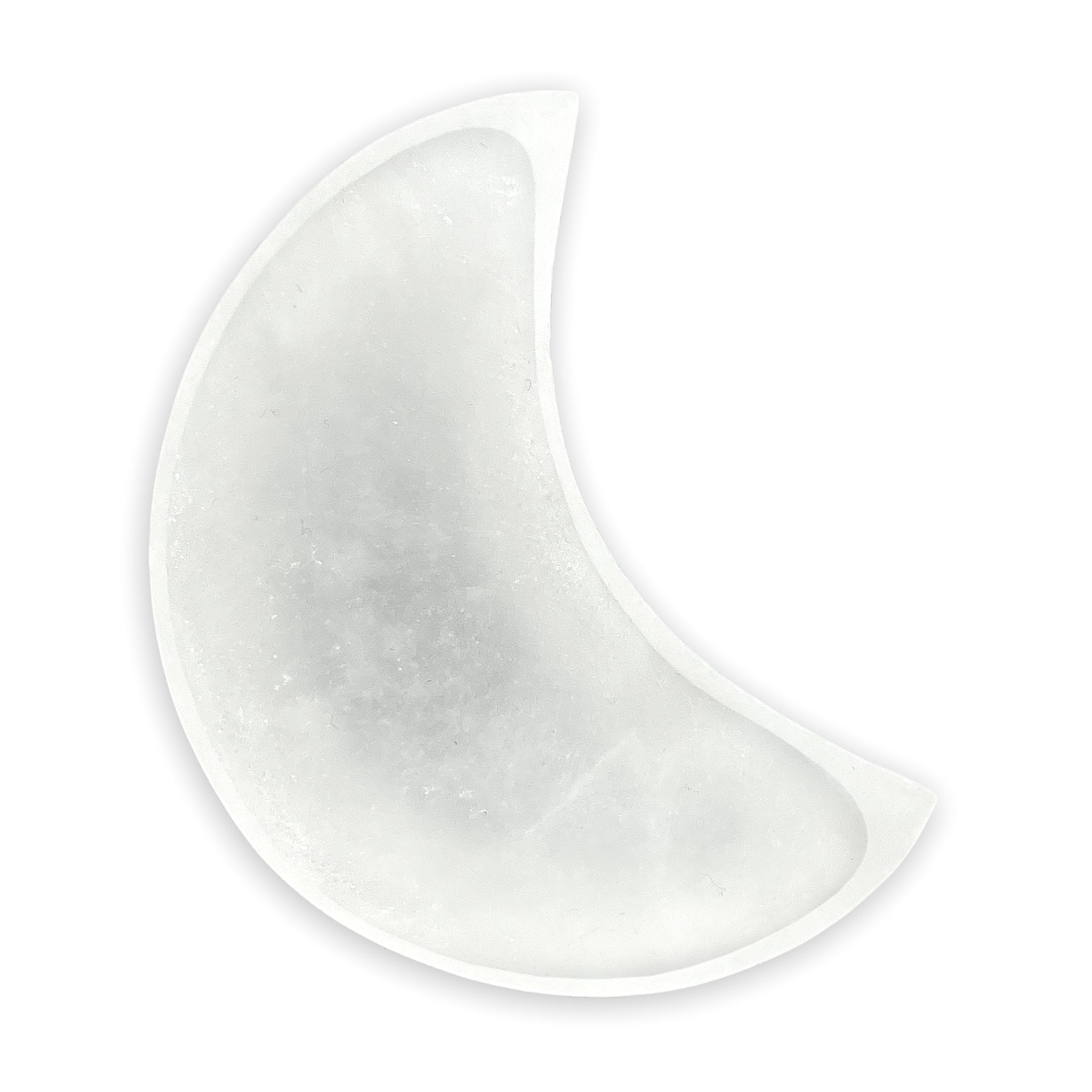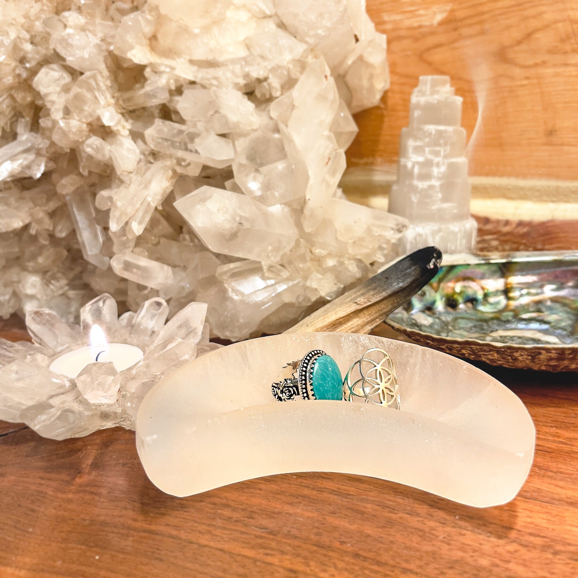 - A crescent moon shaped dish to hold your trinkets and treasures, carved of beautiful Selenite Crystal.