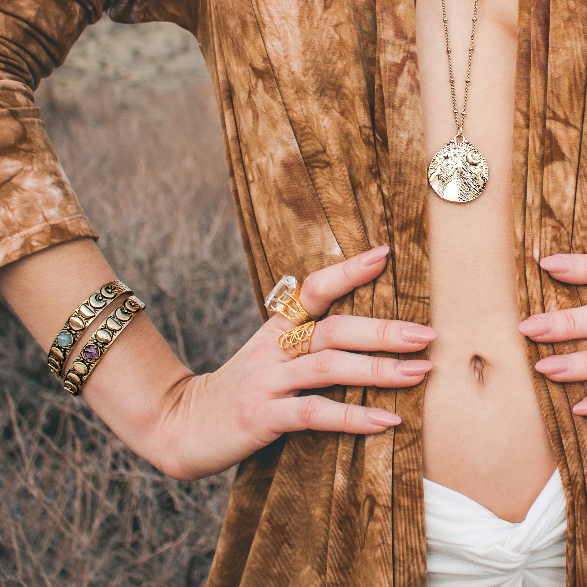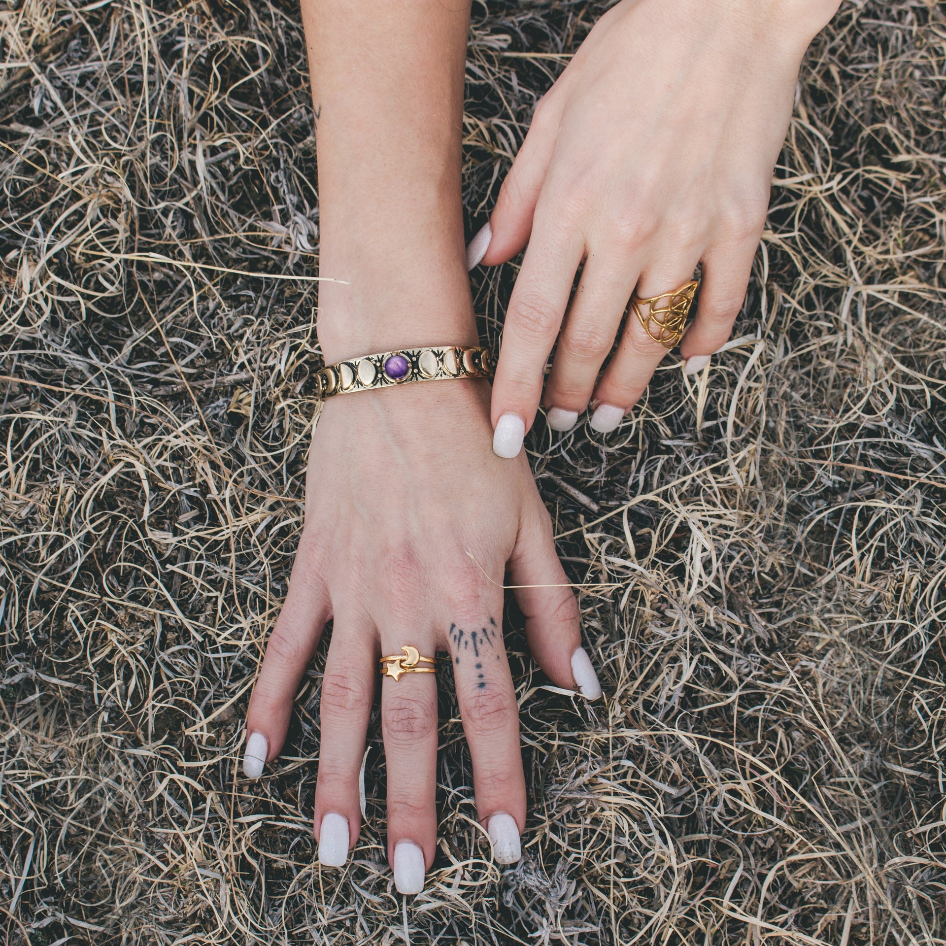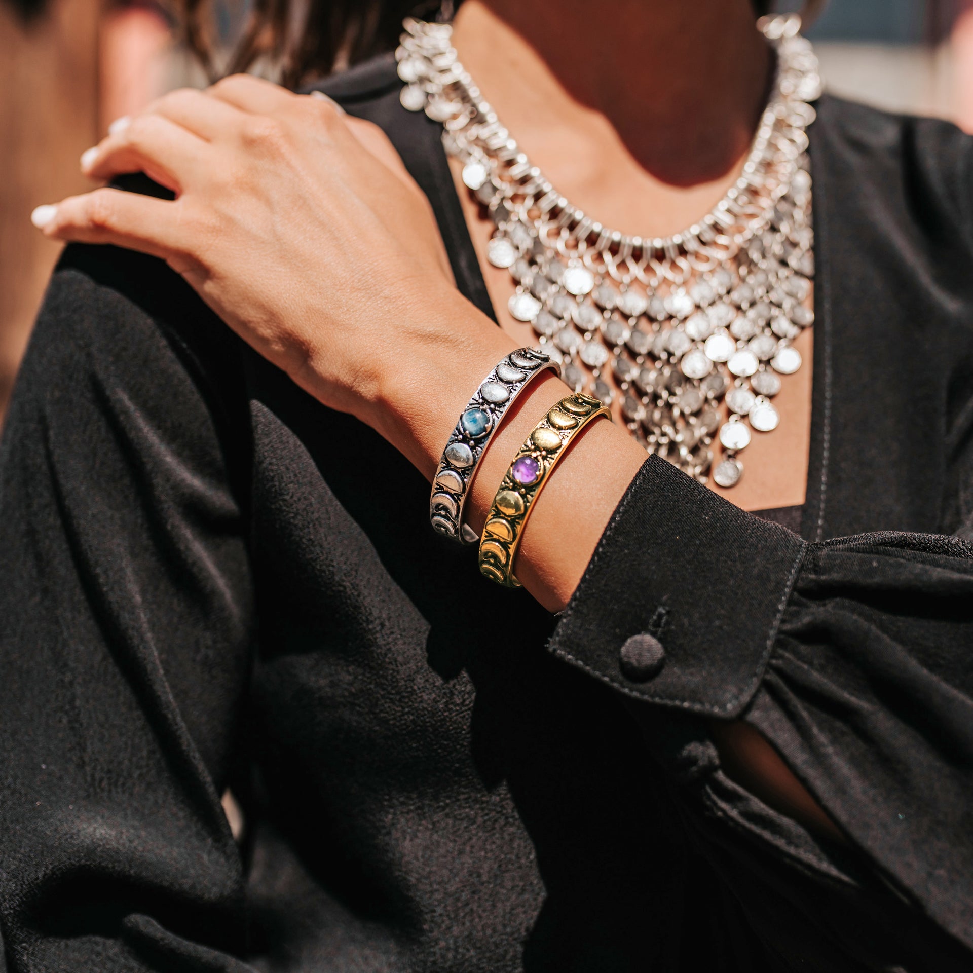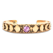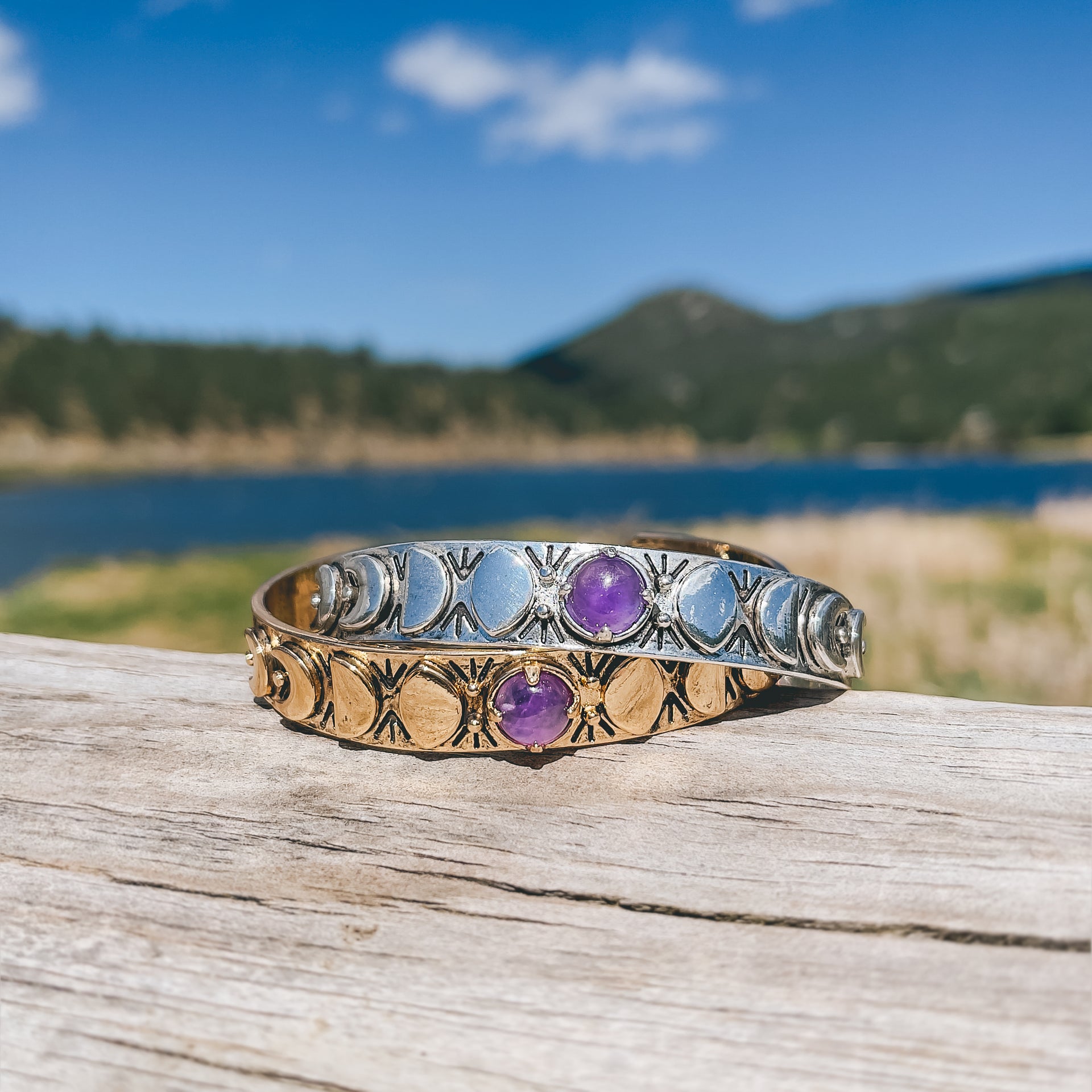 - An Amethyst Cabochon set in a Cuff Bracelet, with a carved Moon Phases, Engraved Geometric Design & Hammered Texture on Band.