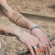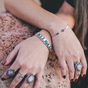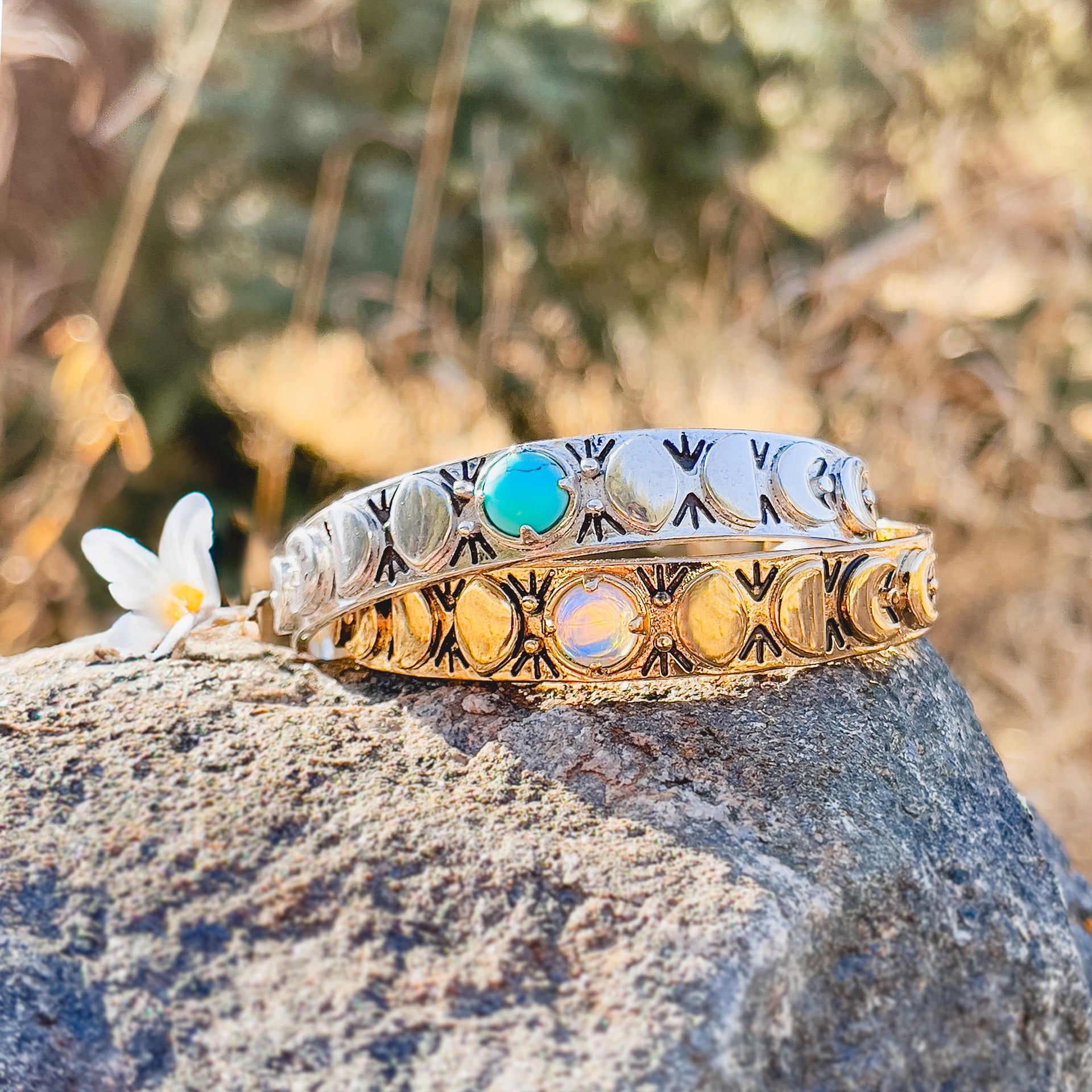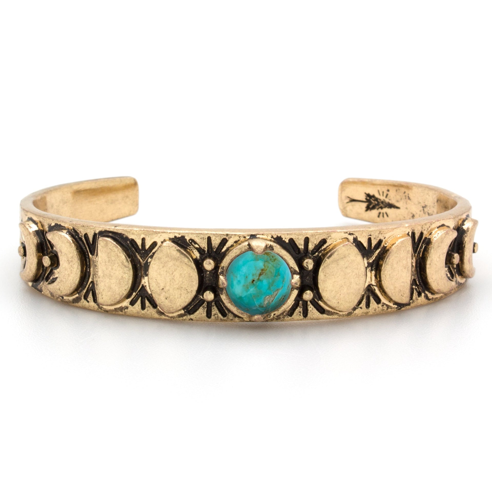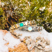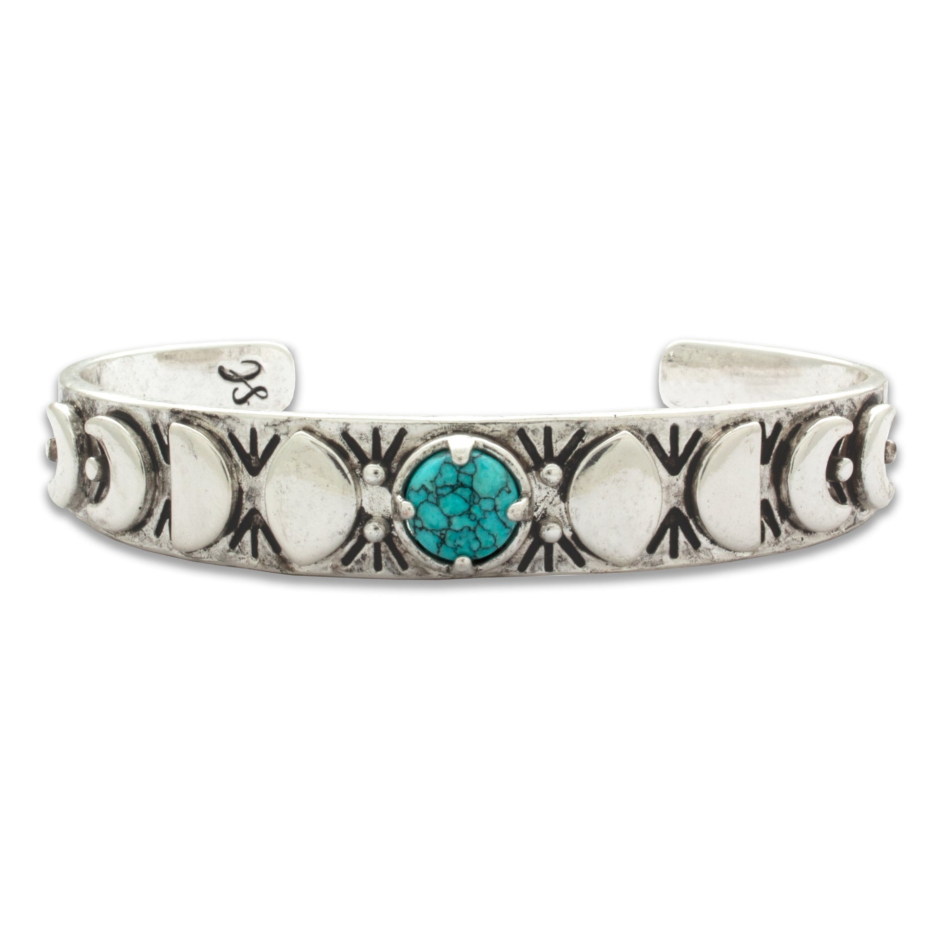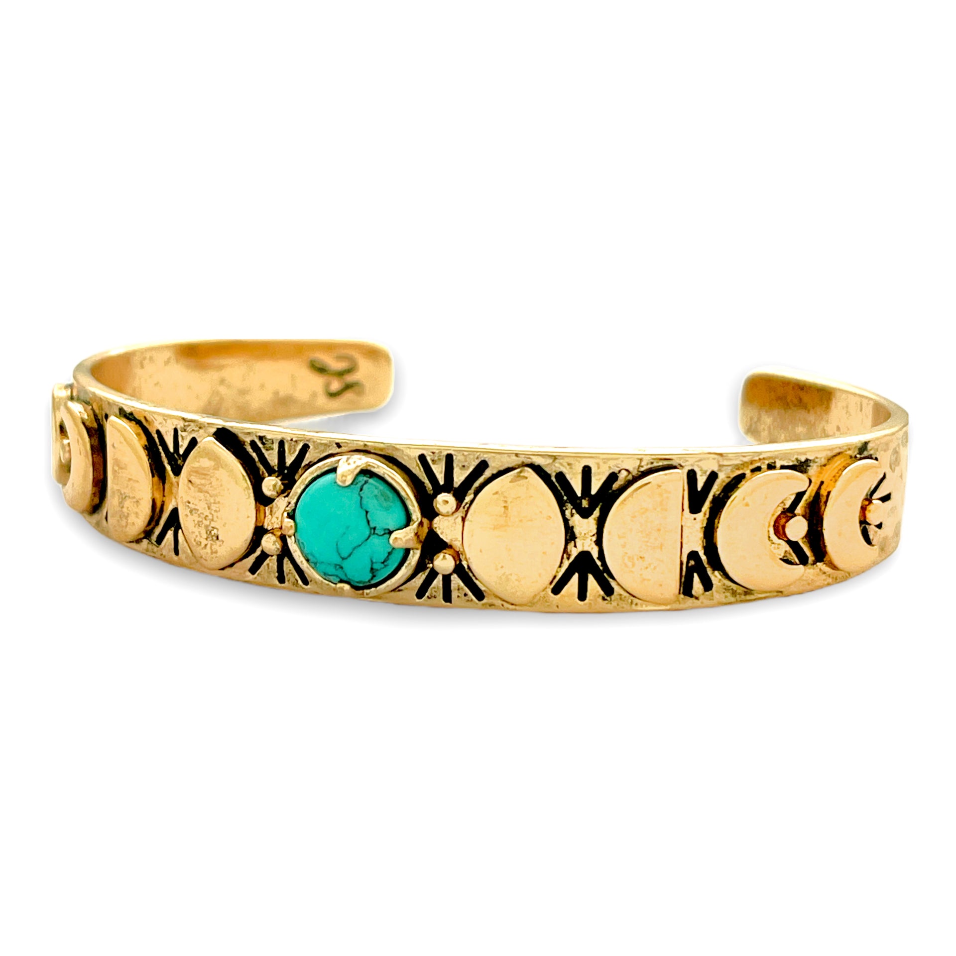 - A Turquoise Cabochon set in a Cuff Bracelet, with a carved Moon Phases, Engraved Geometric Design & Hammered Texture on Band.