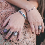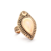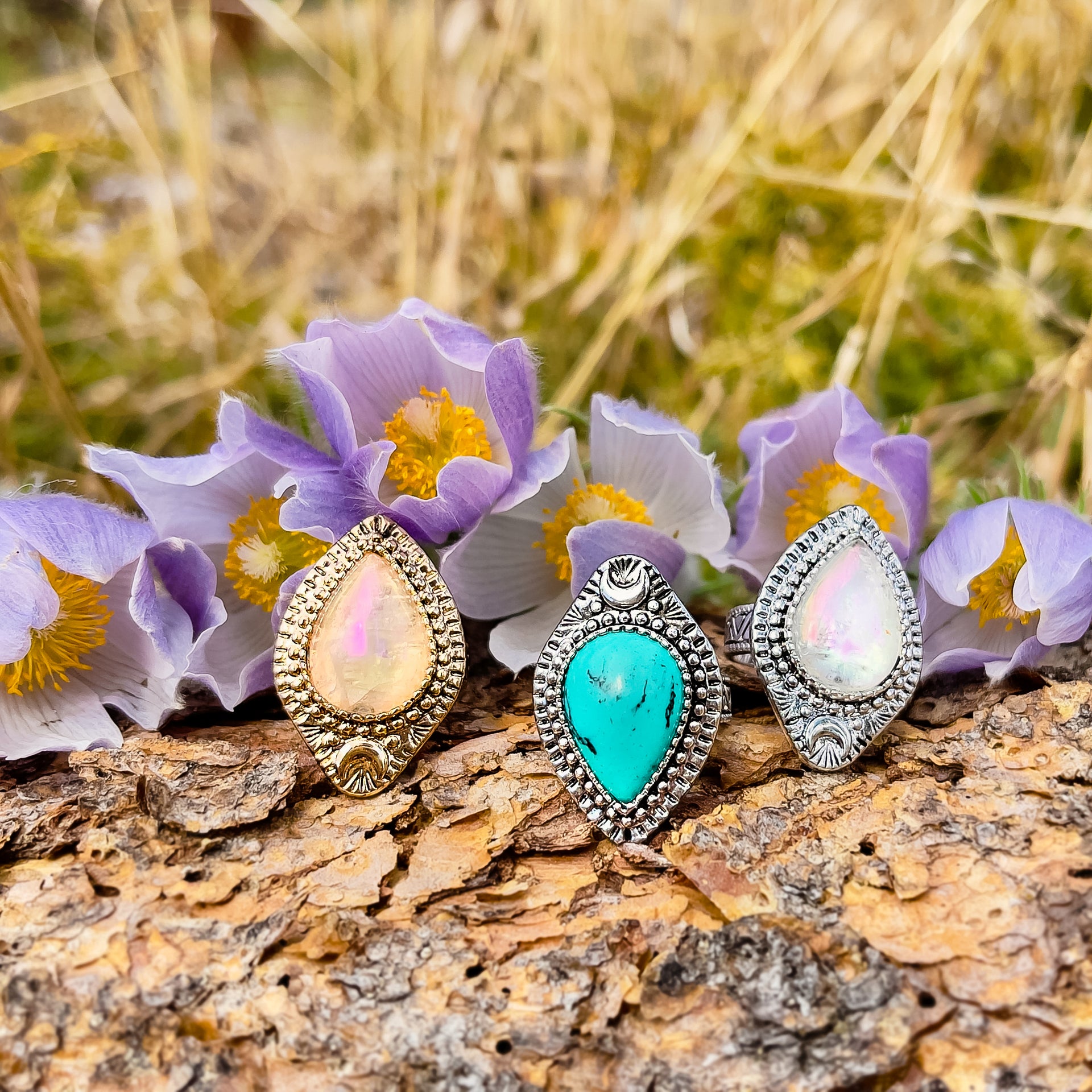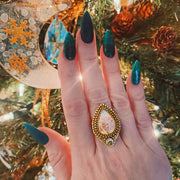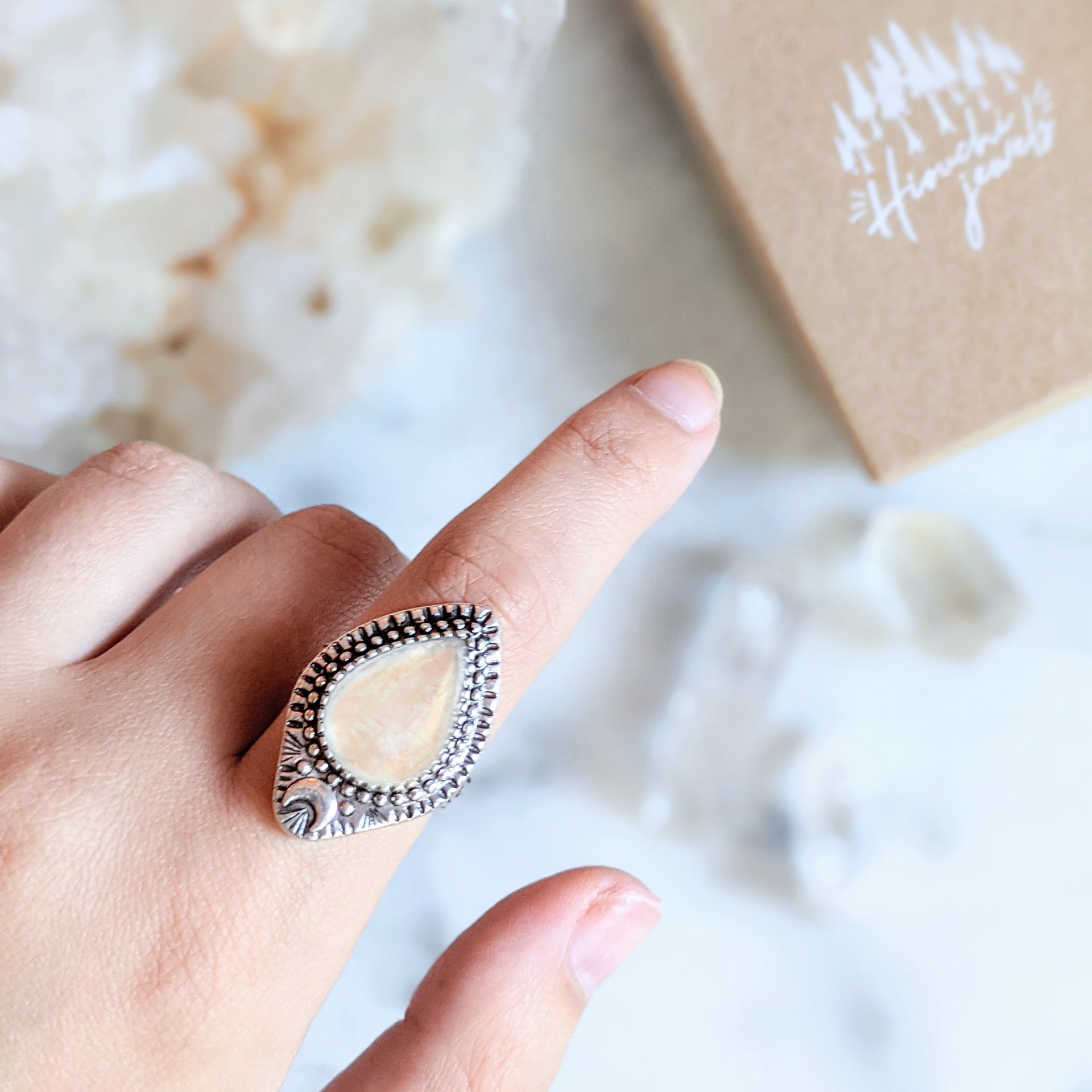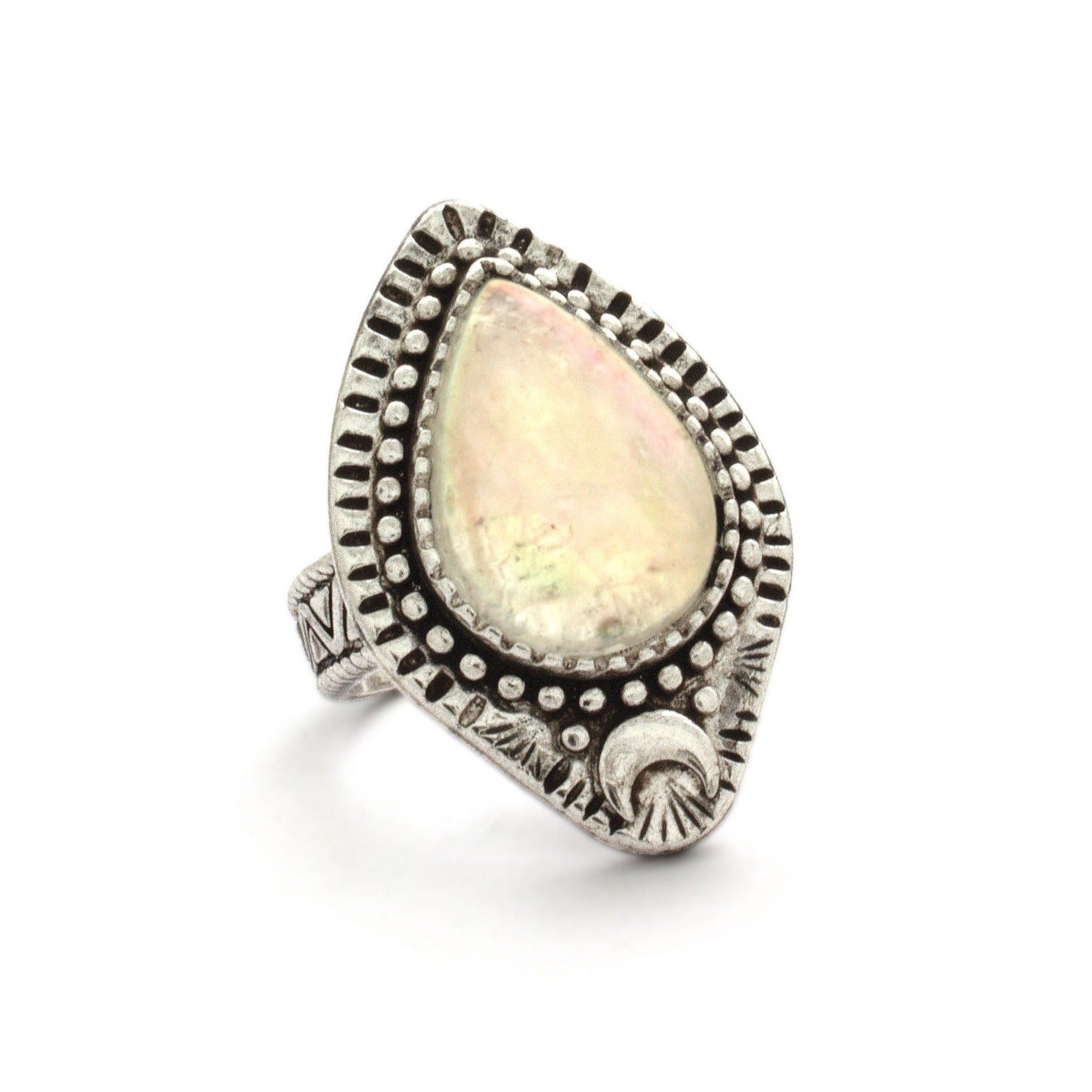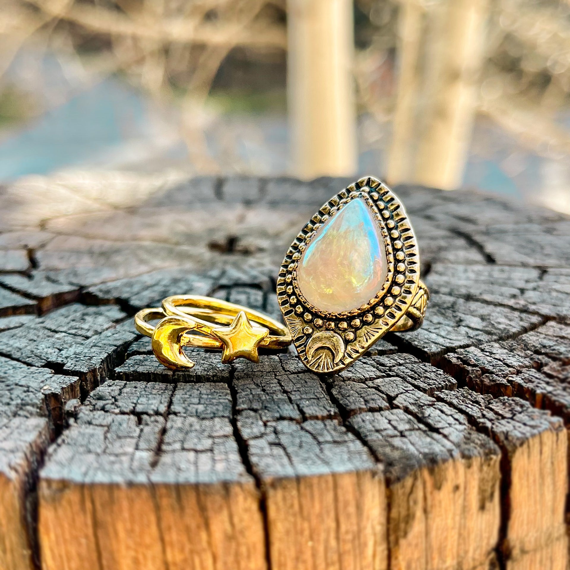 - A Rainbow Treated Quartz Crystal teardrop-shaped cabochon set in a Statement Ring with Crescent Moon Motif.
