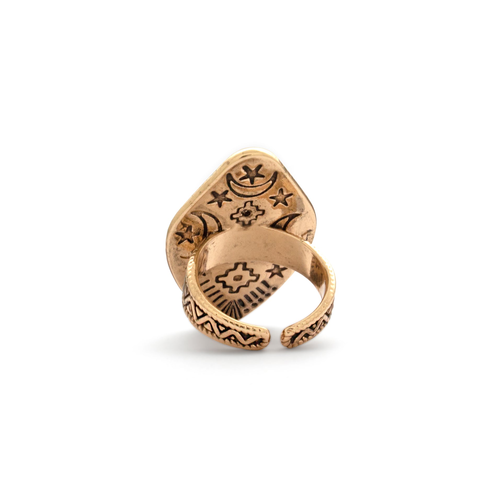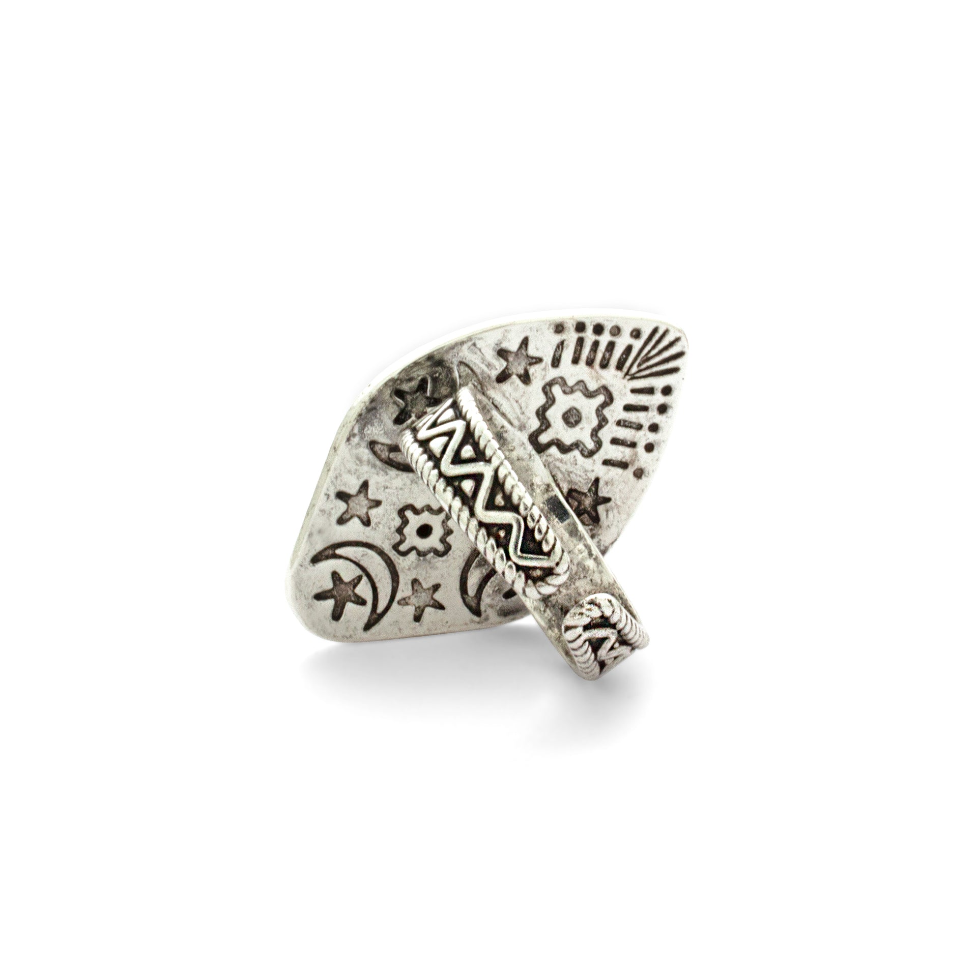 - Geometric and Celestial designs Engraved around the stone, under the setting, and on the band.